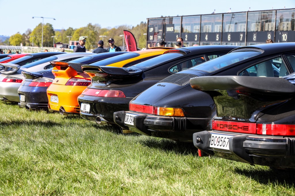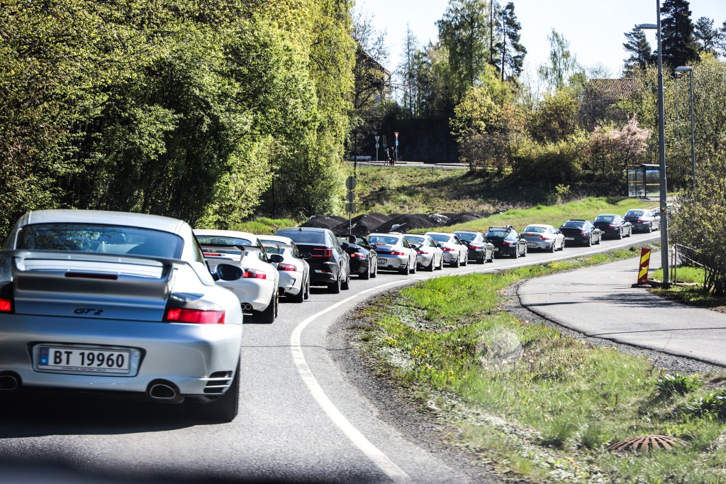 Lang lang rekke når 150 – 200 Porscher drar av gårde fra Hennie Onstadsenteret for å ta turen til vårmønstring på Øvrevoll