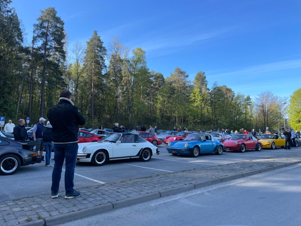 Porscheklubben startet fra parkeringsplassen på Hennie Onstad og det var smekkfult da bilene kjørte av gårde kl 928