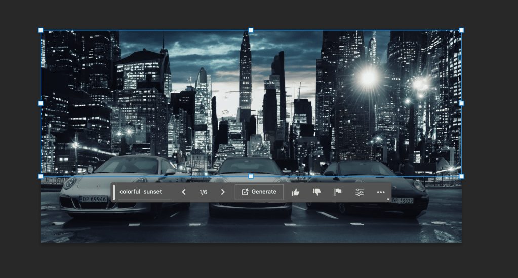 La til en solnedgang i bakgrunnen ved markere himmelen og skrive inn “Colorful sunset”. En solnedgang ble lagt til og sammen med noen flere bygninger også :-).