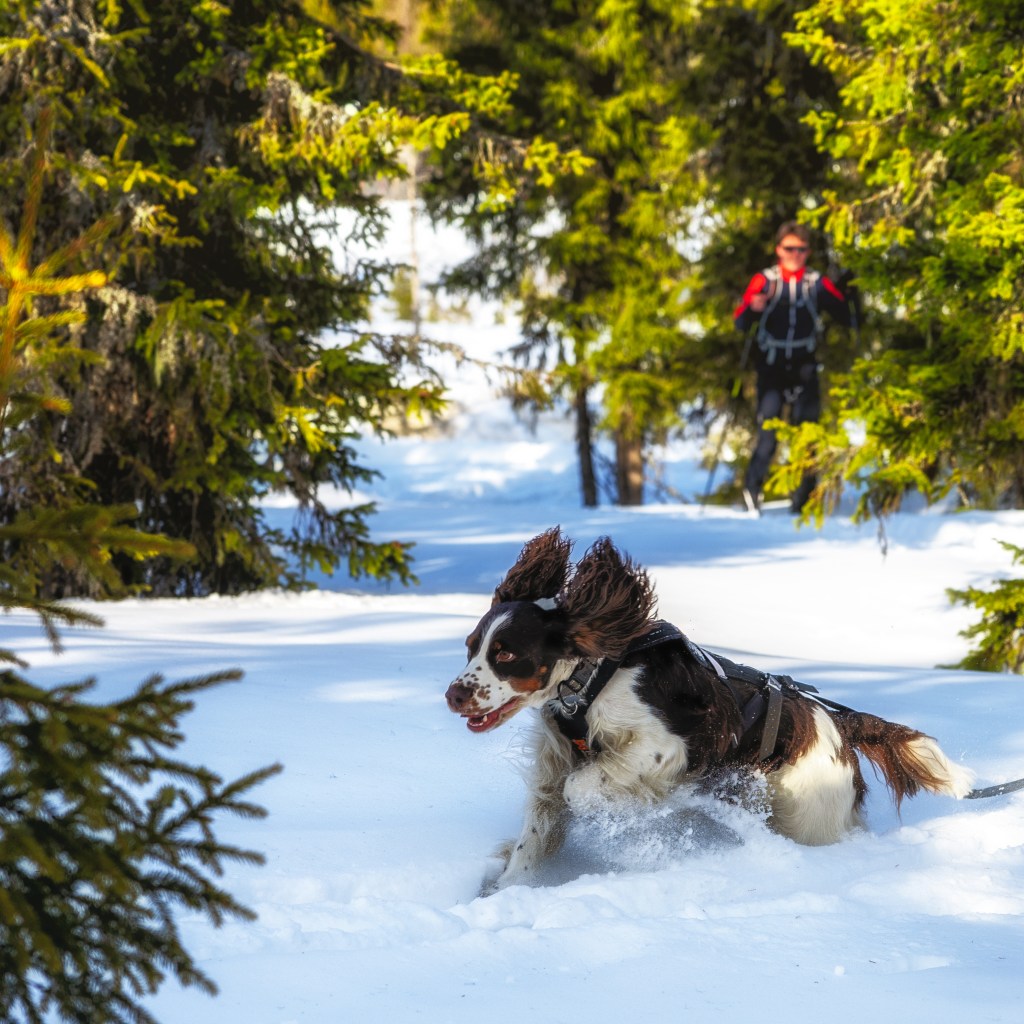Masse snø i påsken og her kommer Fredrik og Nero (Springer Spaniel) hjem fra skitur.