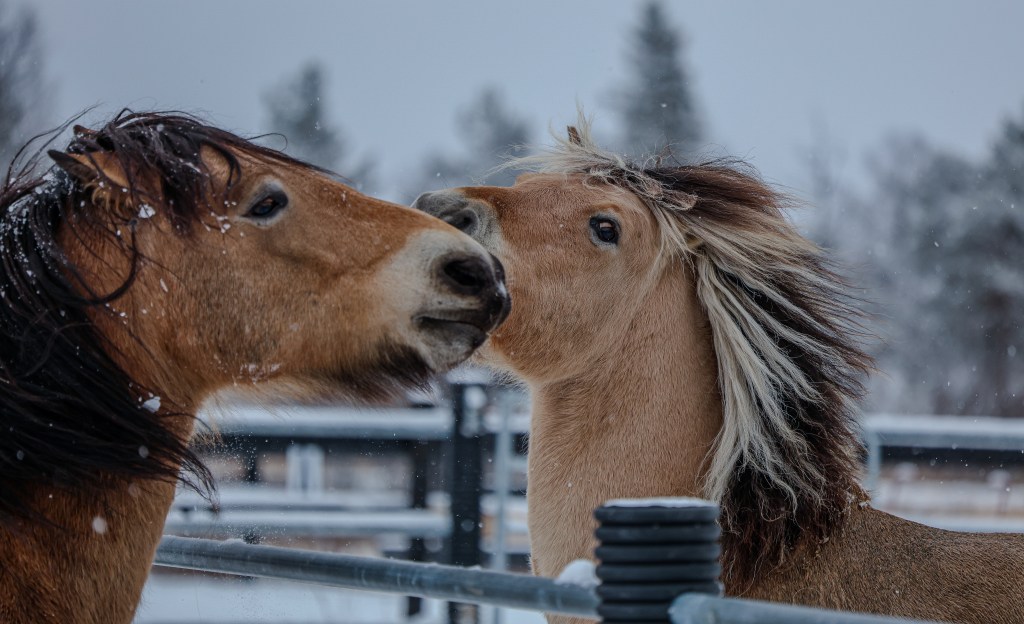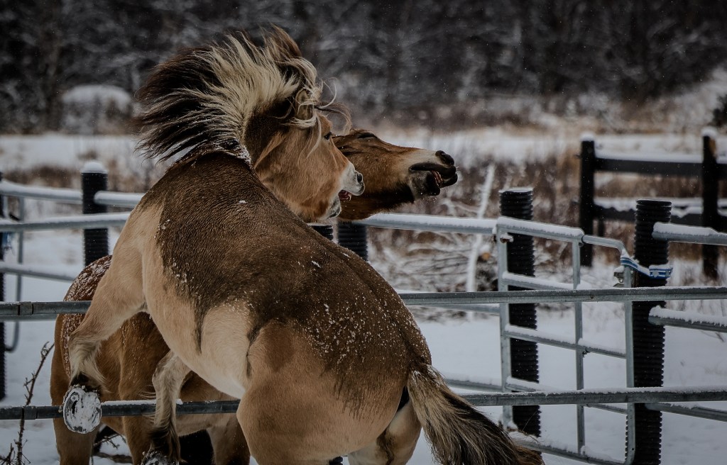 Her er et par relativt nye medlemmer av hesteflokken på Beitostølen Helsesportsenter Ser ut som de prøver å avgjøre den interne rangstigen i flokken.