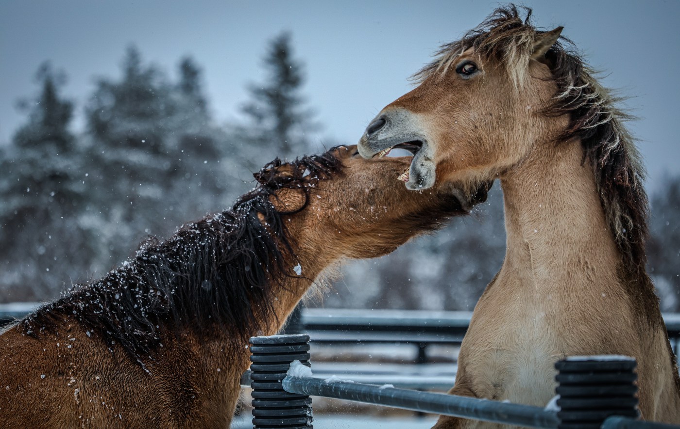 “Et bilde full av liv og dramatikk. Du blir dratt inn i kampen mellom de to hestene takket være den gode kamerateknikken din, som gjør dyrene skarpe og detaljerte, mens snøen er vakkert fryst med en perfekt lukkertid”
