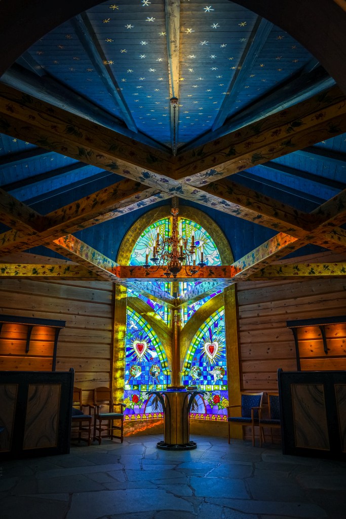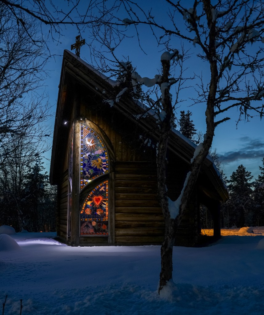 Kapellet ved BHSS lyser fint opp i mørket, nysnø gir også fin stemning. Under er det bilde fra innsiden og utsiden