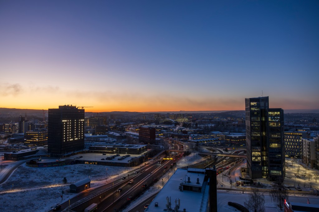 Avslutter året med et par bilder fra soloppgangen med utsikt fra taket på kontoret til http://www.nettbil.no som ligger i Økern Portal