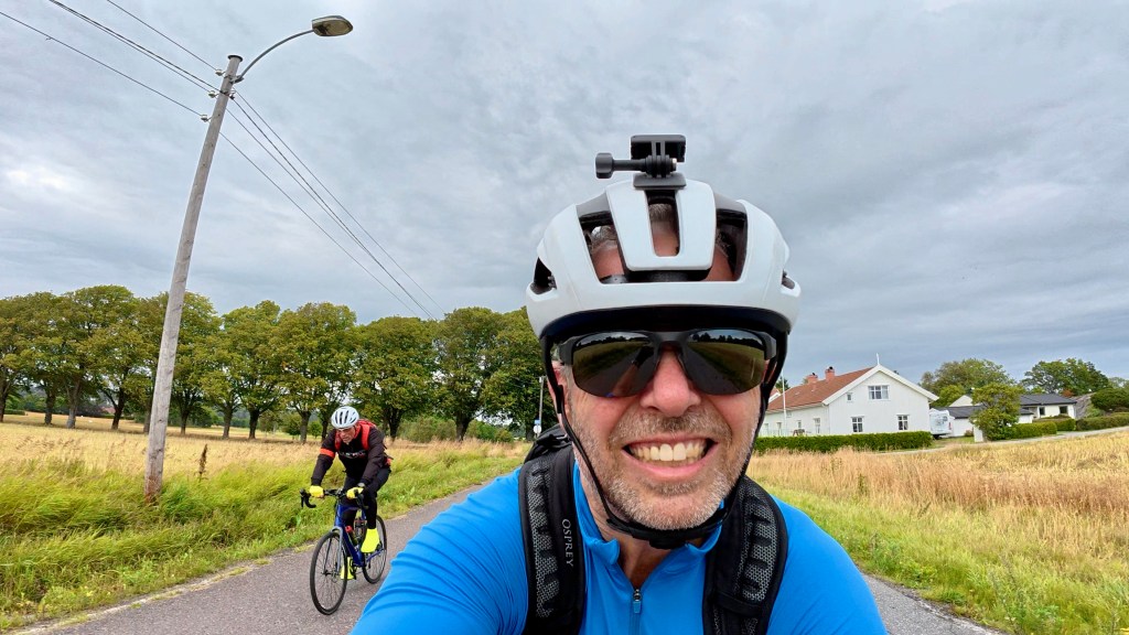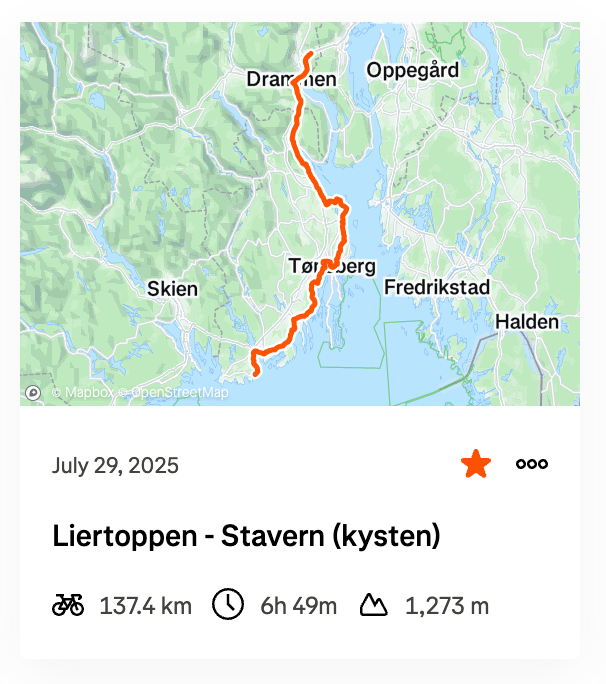 Dvs. Vi satte oss å på landeveissyklene våre og satte kurs mot Stavern. Planen var å følge ruten under, men som i 2018 hadde vi sterk motvind hele veien og i Holmestrand besluttet vi oss for å legge ruta litt lenger inn og dermed spare nesten 2 mil.