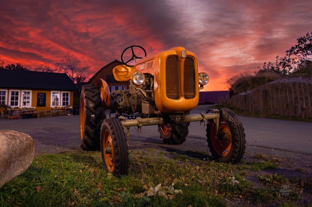 Kommentar til motivet: Høsten 2025 hadde jeg mange fine morgener i Stavern i jakten på soloppganger, her en rød himmel i det jeg passerte Gårdsutsalget på Grevle. De har en kul traktor på utsiden og her jeg ønsket å fremheve i bildet.